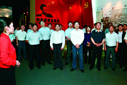 5月24日,在蘭考縣焦裕祿同志紀(jì)念館內(nèi),市委書記魏小東(前排右三)、市長(zhǎng)范修芳(前排右四)等認(rèn)真聆聽講解員的講解。