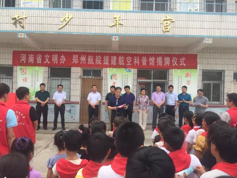 7月11日,河南省委宣傳部常務(wù)副部長(zhǎng)蘇長(zhǎng)青、副部長(zhǎng)張曼如、省文明辦專(zhuān)職副主任王飛等同志帶領(lǐng)部機(jī)關(guān)有關(guān)人員,與鄭州航空管理學(xué)院有關(guān)領(lǐng)導(dǎo)和志愿者師生一行,分別到省委宣傳部幫扶貧困村周口市西華縣半截樓村和漯河市舞陽(yáng)縣余莊村,為省文明辦、鄭州航院援建的航空科普館和鄭州航院志愿服務(wù)基地舉行揭牌儀式。